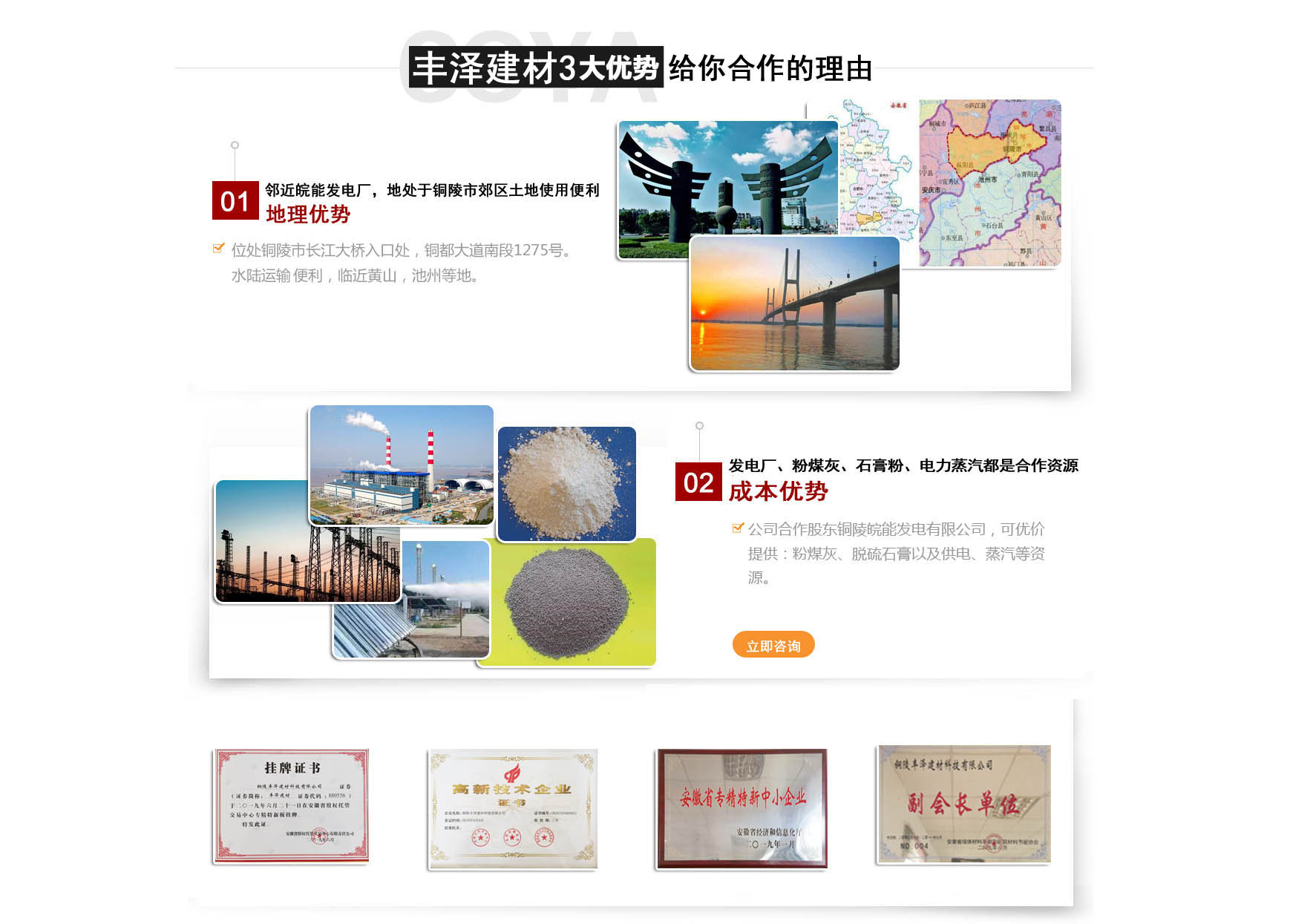 銅陵豐澤建材科技有限公司成立于2007年2月,坐落于銅都大道南段,占地4萬(wàn)平方米,公司注冊(cè)資金1000萬(wàn)元,現(xiàn)有職工百余人,是一家與皖能發(fā)電公司合作,專業(yè)從事電廠粉煤灰開發(fā)利用的高新科技企業(yè),現(xiàn)擁有一條年產(chǎn)30萬(wàn)立方米蒸壓加氣混凝土全自動(dòng)生產(chǎn)線。 蒸壓加氣混領(lǐng)土(英文名Autoclaved aerated comcrete),也稱AAC,是以砂、粉煤灰等硅質(zhì)材料和石灰、水泥等鈣質(zhì)材料為主要原料,摻加鋁粉為發(fā)氣劑,進(jìn)行生產(chǎn)的新型墻體材料。是我國(guó)推廣應(yīng)用最早,使用最廣泛,技術(shù)最完整的輕質(zhì)保溫墻體材料之一,自問(wèn)世以來(lái),始終方興未艾,備受推崇。